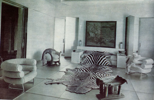Gray’s breakthrough to the public eye came when she was asked to decorate an expensive apartment on the rue de Lota. The laquer funiture and decorative panels she made with Sugawra became part of this commission and when the new apartment was revealed it caused a stir, becoming hugely admired and widely photographed.  Just as significant as the laquer and more “deco-style work, Gray had also designed and made beautiful new steel frame furniture, entirely from scratch, including her radical, ultra-modern Bidendum chair